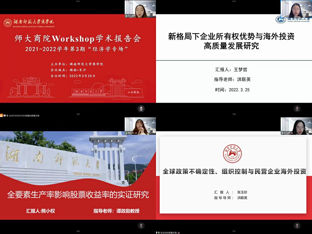 (通讯员 刘玉梅)3月25日下午,公司通过线上方式举办第7期workshop学术报告会。2019级研究生孙小芳、王梦哲、熊小权、张玉珍作主题报告,指导老师洪联英教授、杨柳副教授出席了此次报告会。