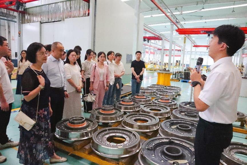 在九方装备办公室副主任周涛和团委书记黄翰轩的热情带领和介绍下,师生们首先来到驱动集成部件车间。九方装备致力于发展城市轨道交通集成部件产品,建设拥有轮对组成组装生产线等多条生产线,不仅通过EN15085欧洲机车焊接质量标准体系认证等5项体系认证,还建有独立恒温试验站等6大类产品实验验证系统平台,技术成熟并具有保障。车间内,自动化生产线高效运转,各类先进设备有序作业。办公室副主任周涛和团委书记黄翰轩现场介绍了驱动集成部件的生产工艺和技术创新点,师生们近距离观察了零部件加工过程,纷纷惊叹于九方装备在驱动系统领域的领先技术,切实感受到“中国智造”的硬核实力。
