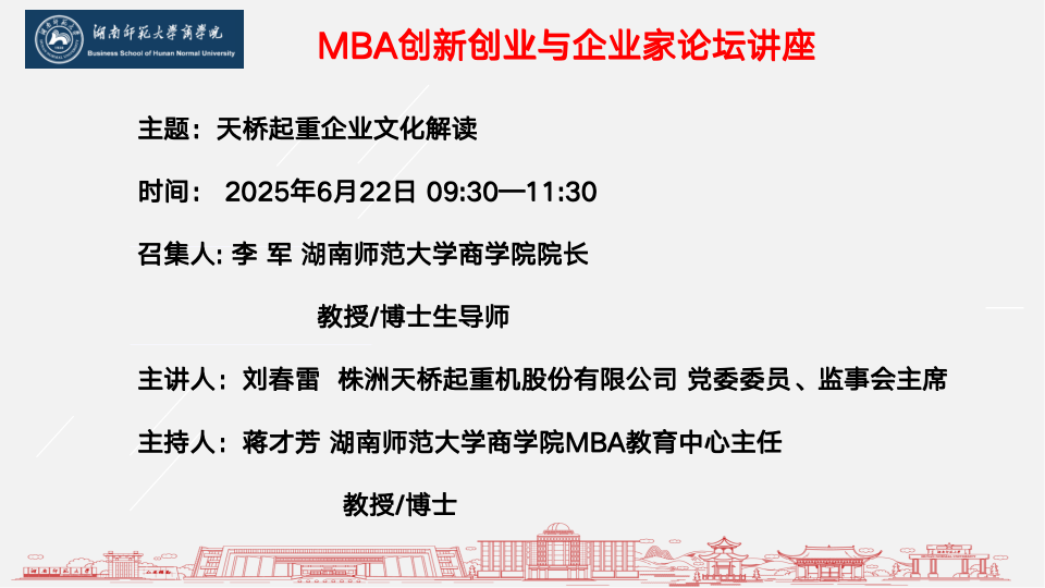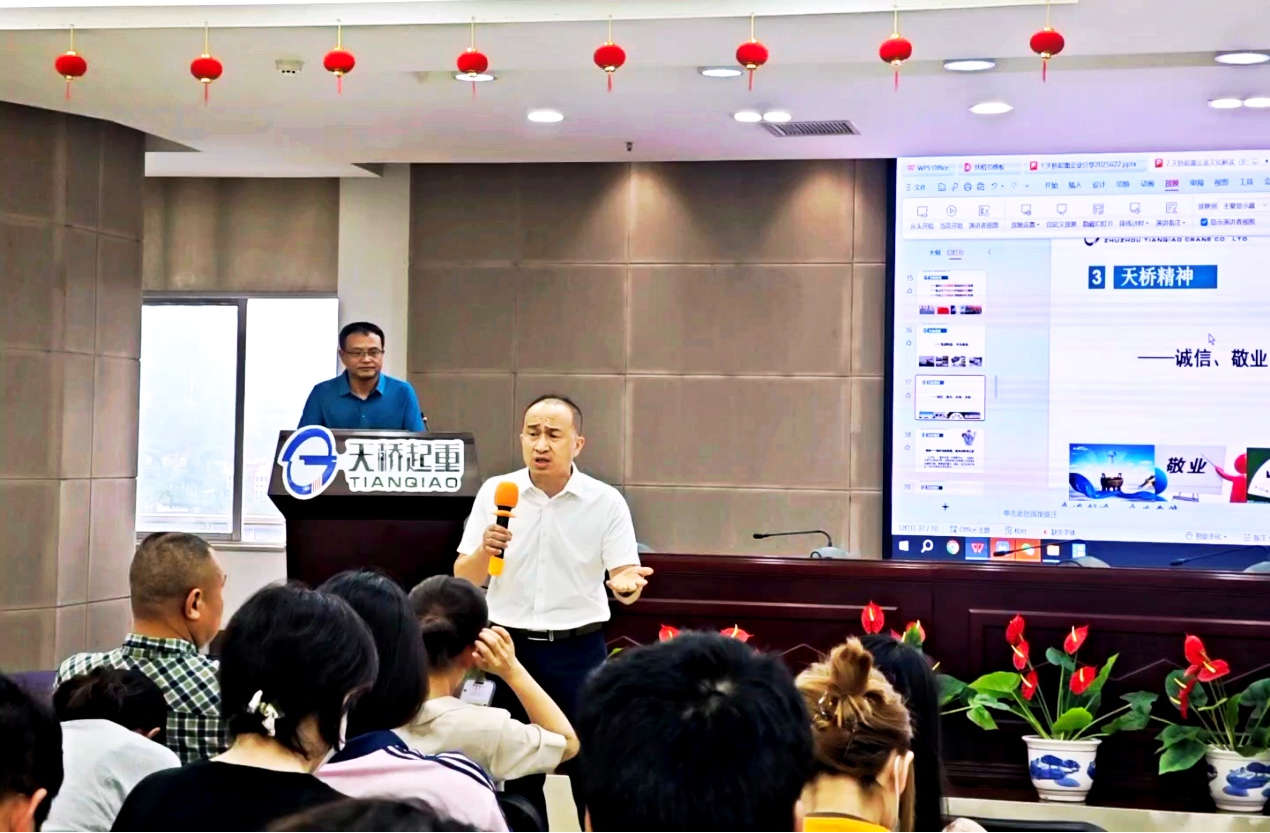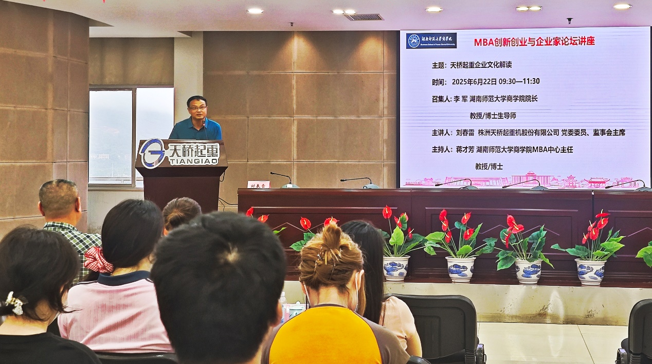 2025年6月22日上午,在参访株洲天桥起重机股份有限公司(简称天桥起重)期间,株洲天桥起重机股份有限公司党委委员、监事会主席刘春雷为2024级MBA全体学员带来主题讲座,深度解读天桥起重“天道酬勤”的文化基因与创新实践。