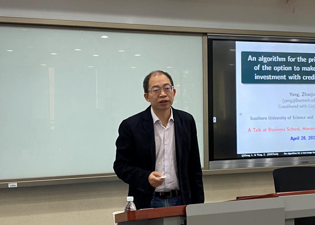 (通讯员 李柯逸)4月28日上午,南方科技大学金融系杨招军教授莅临太阳成集团tyc122ccvip讲学,在中和楼401作题为“基于信用担保的两阶段投资的实物期权算法”的学术讲座。讲座由副经理李红权主持。